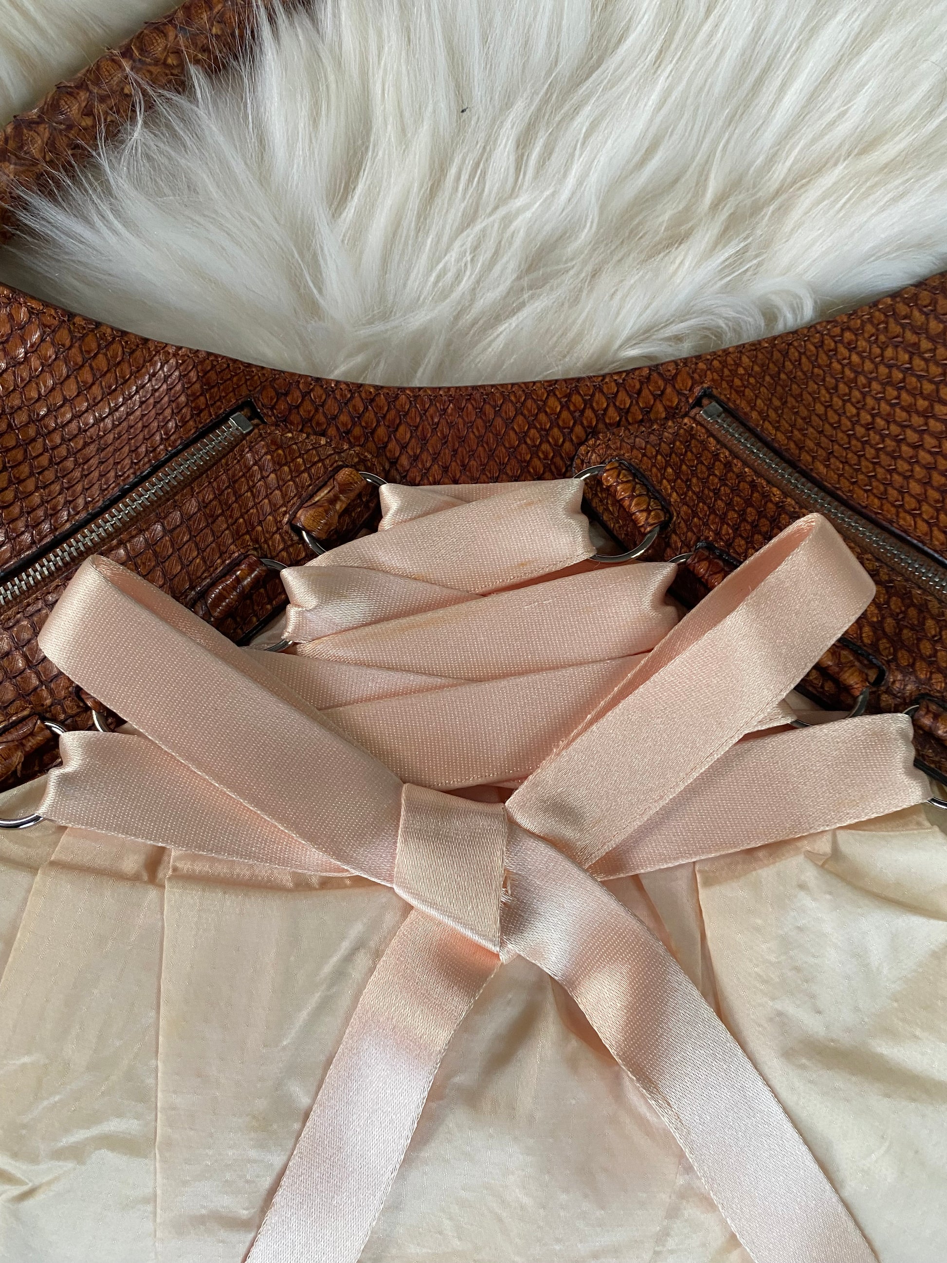 Vintage condition: very good; no/ little signs of use on exterior (barely visible signs of use on the fabric bow) and interior of the bag (none); little scratching on hardware (none); odor (none).